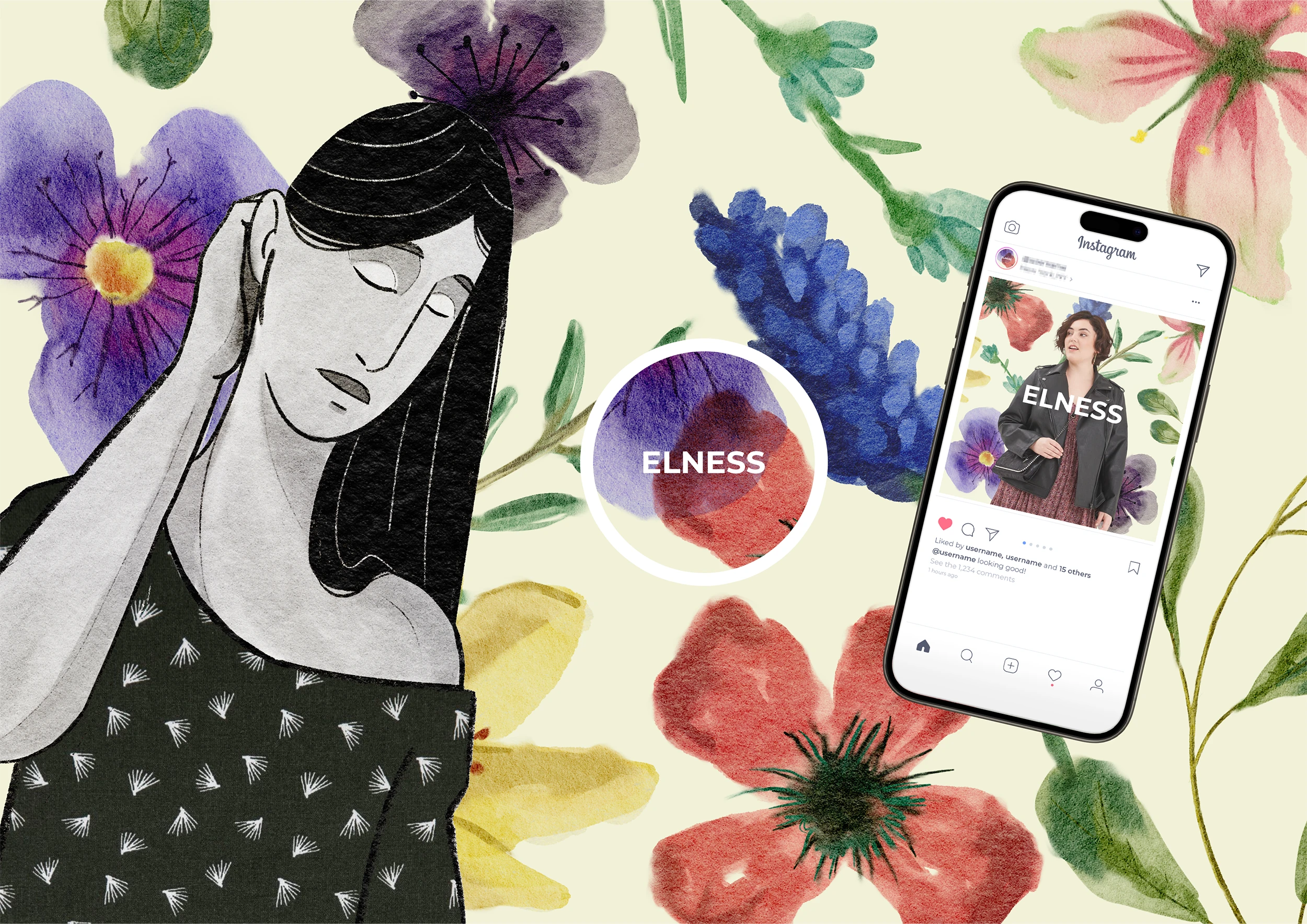 Elness est un fabricant français de prêt-à-porter pour femmes rondes, déterminé à inspirer joie et confiance chez ses clientes grâce à ses motifs fleuris, ses couleurs vibrantes, ses tissus de qualité, ainsi que la rigueur de sa fabrication. Nous avons développé une identité visuelle intégrant ces valeurs et objectifs dans un logo à la fois dynamique et sérieux, adaptable à divers contextes d'utilisation.