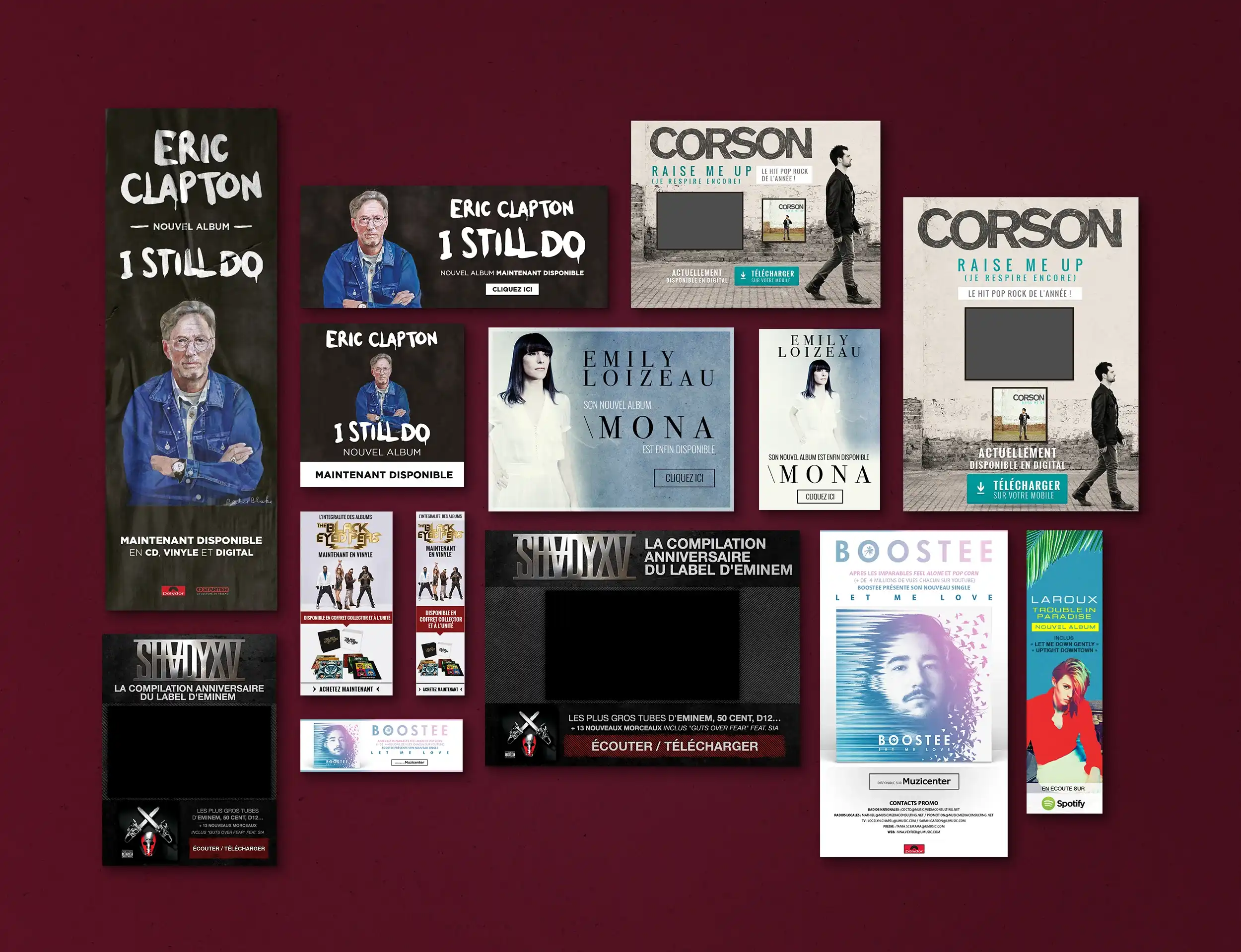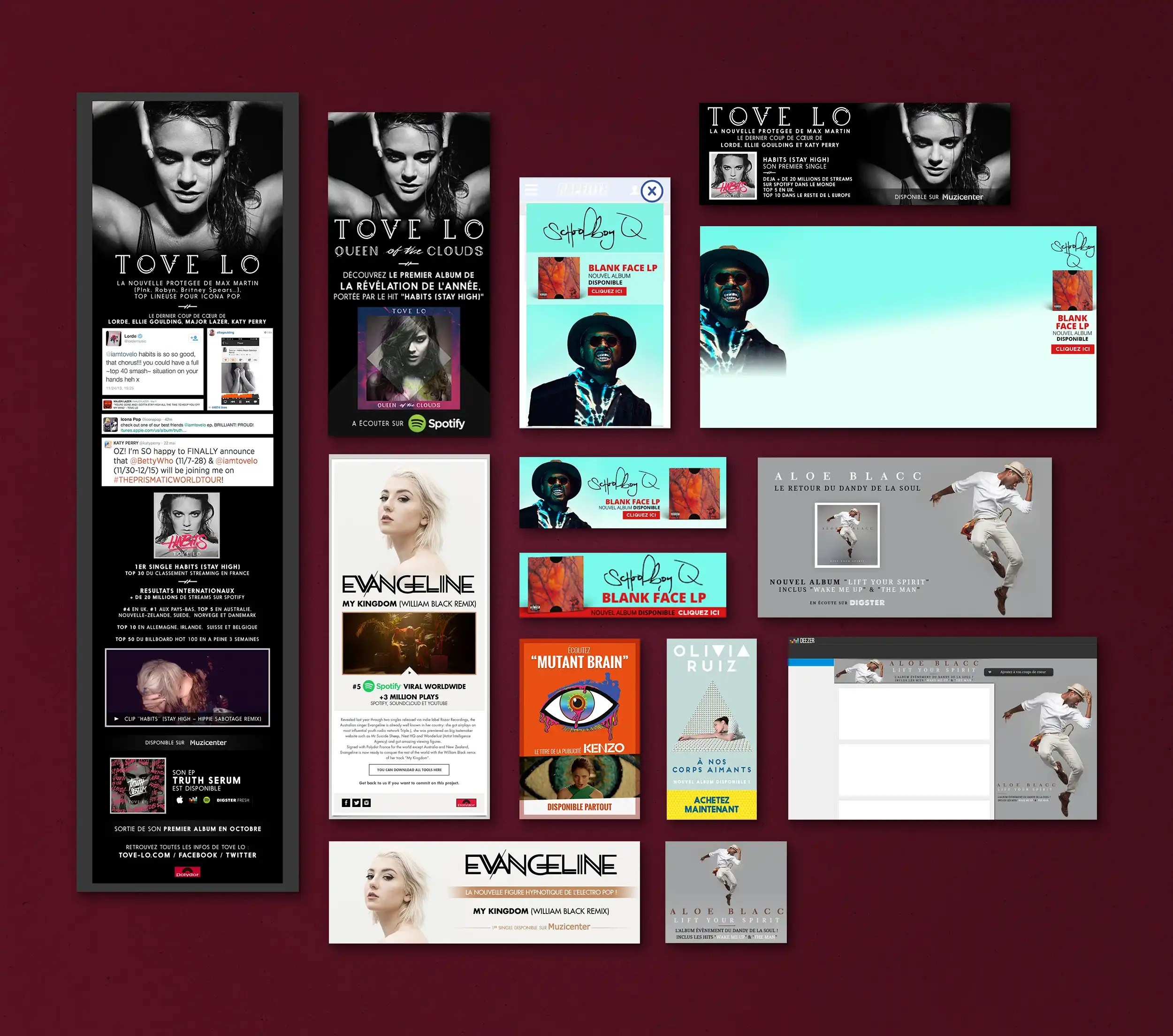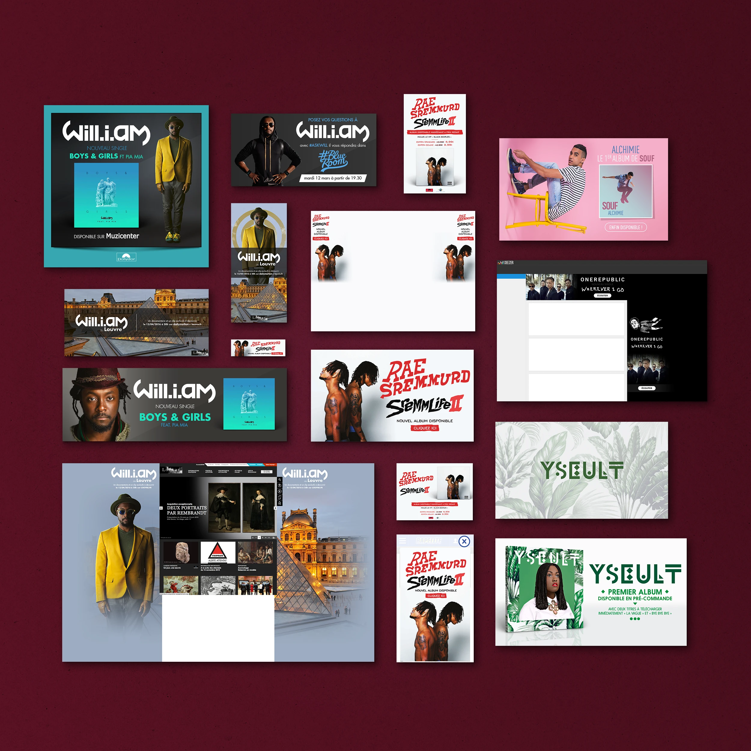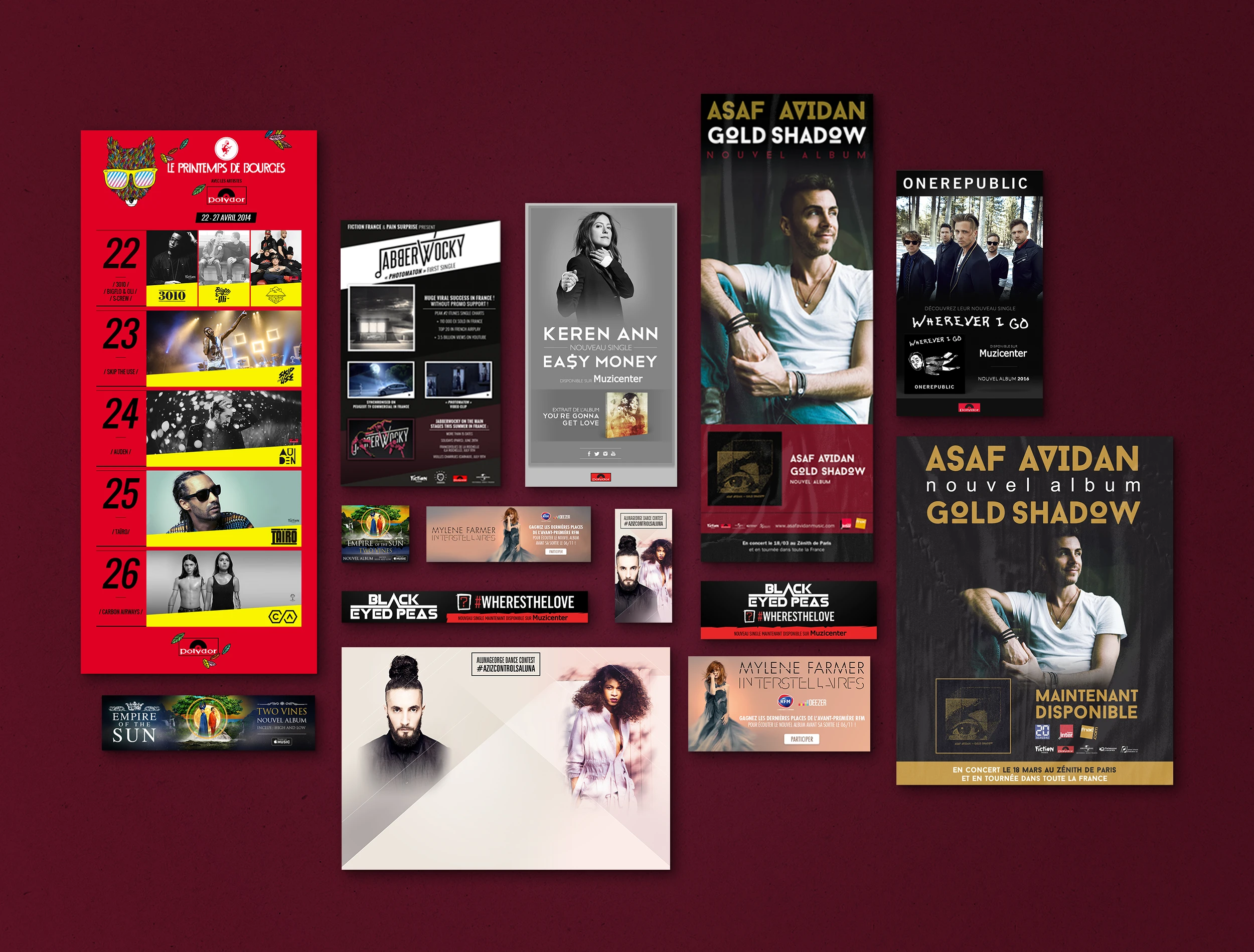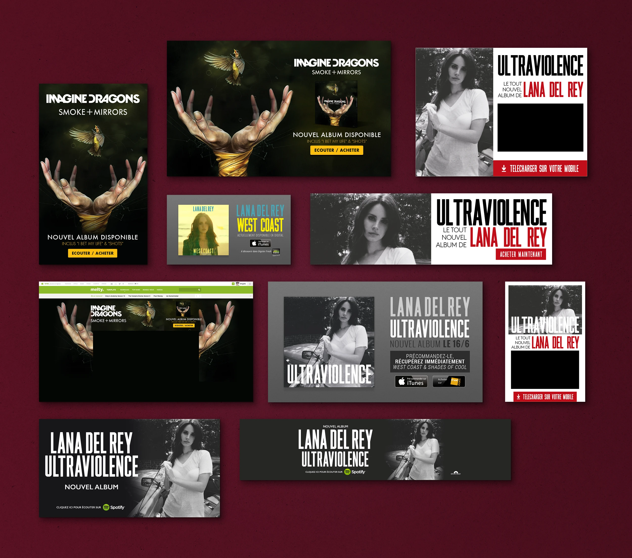 Éléments print : Affichage, pubs presse, flyers, ... Éléments web : Ecards, newsletters, newsletters responsive, mini-site, modules web, vidéos, pubs web, habillages, ...