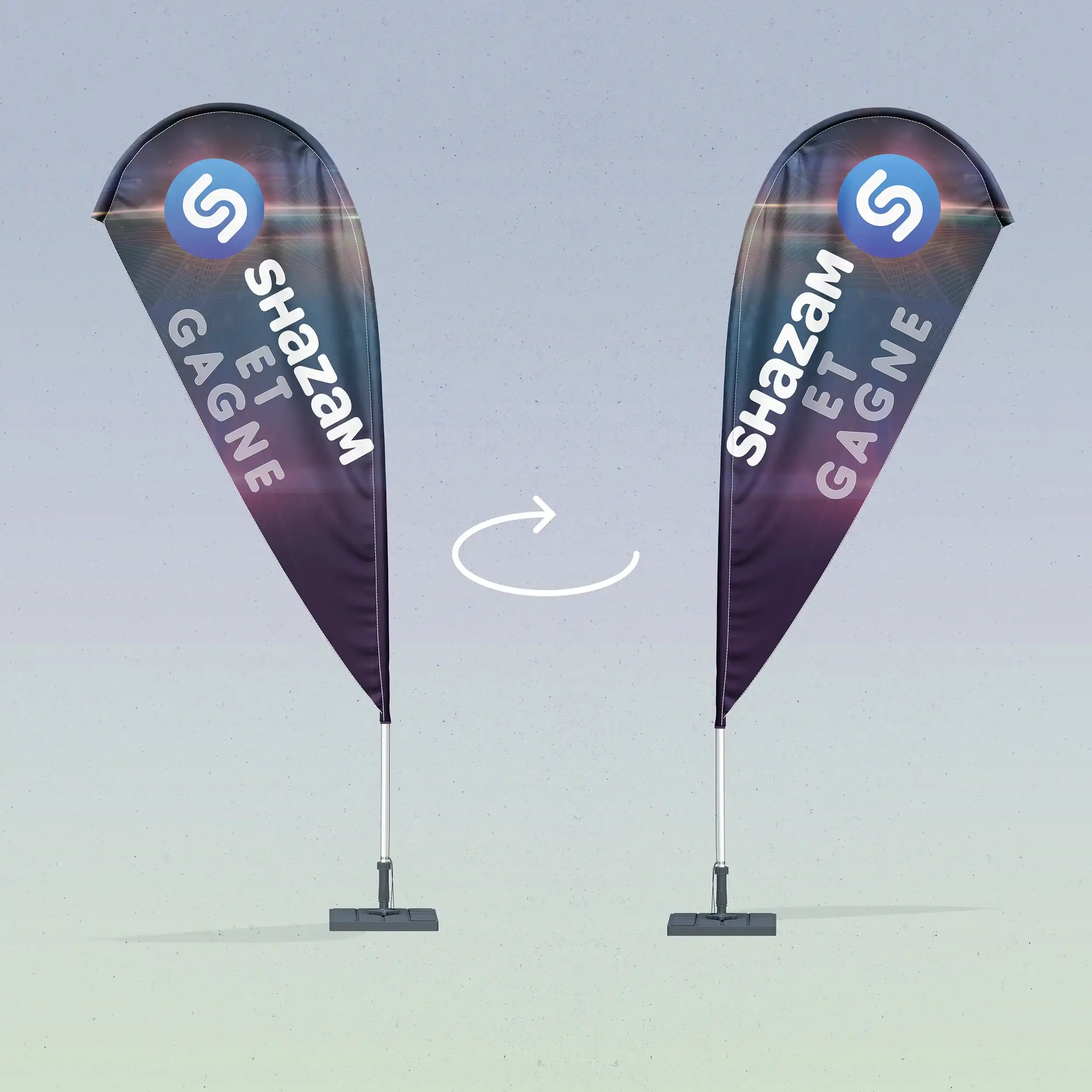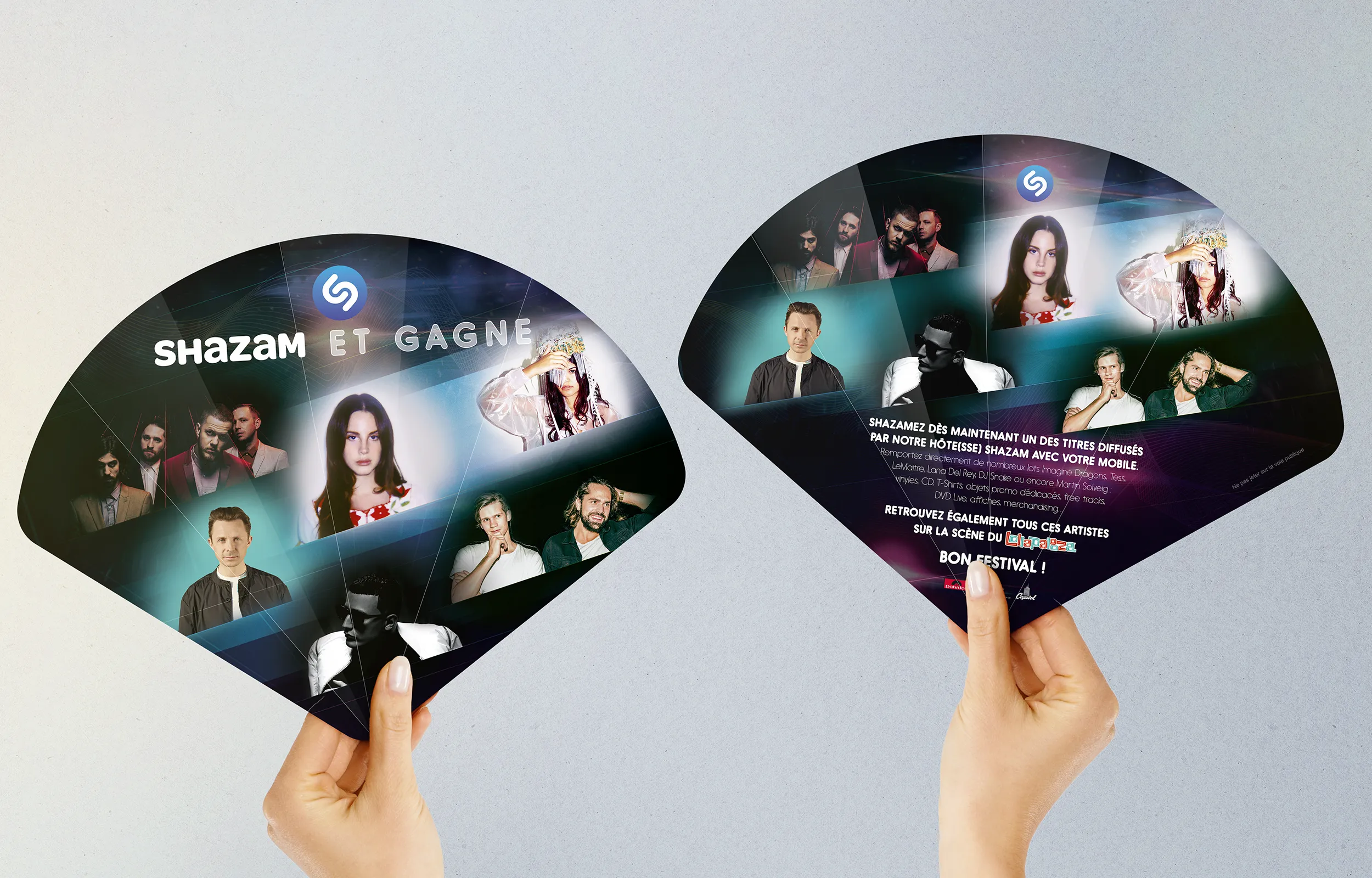 Création et habillage d'outils promotionnels, drapeau et éventail, pour le partenariat Polydor x Shazam lors du festival Lolapalooza.