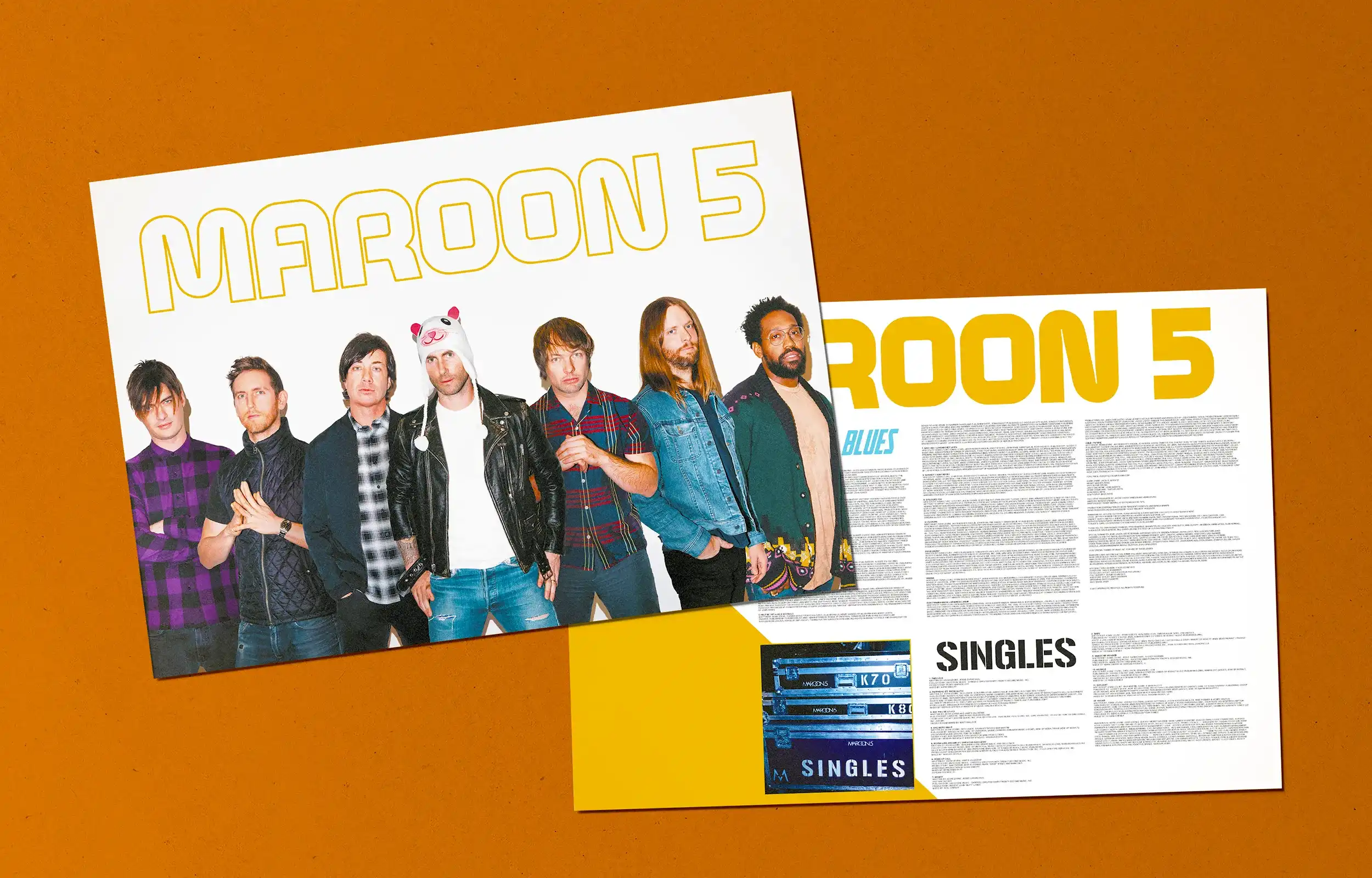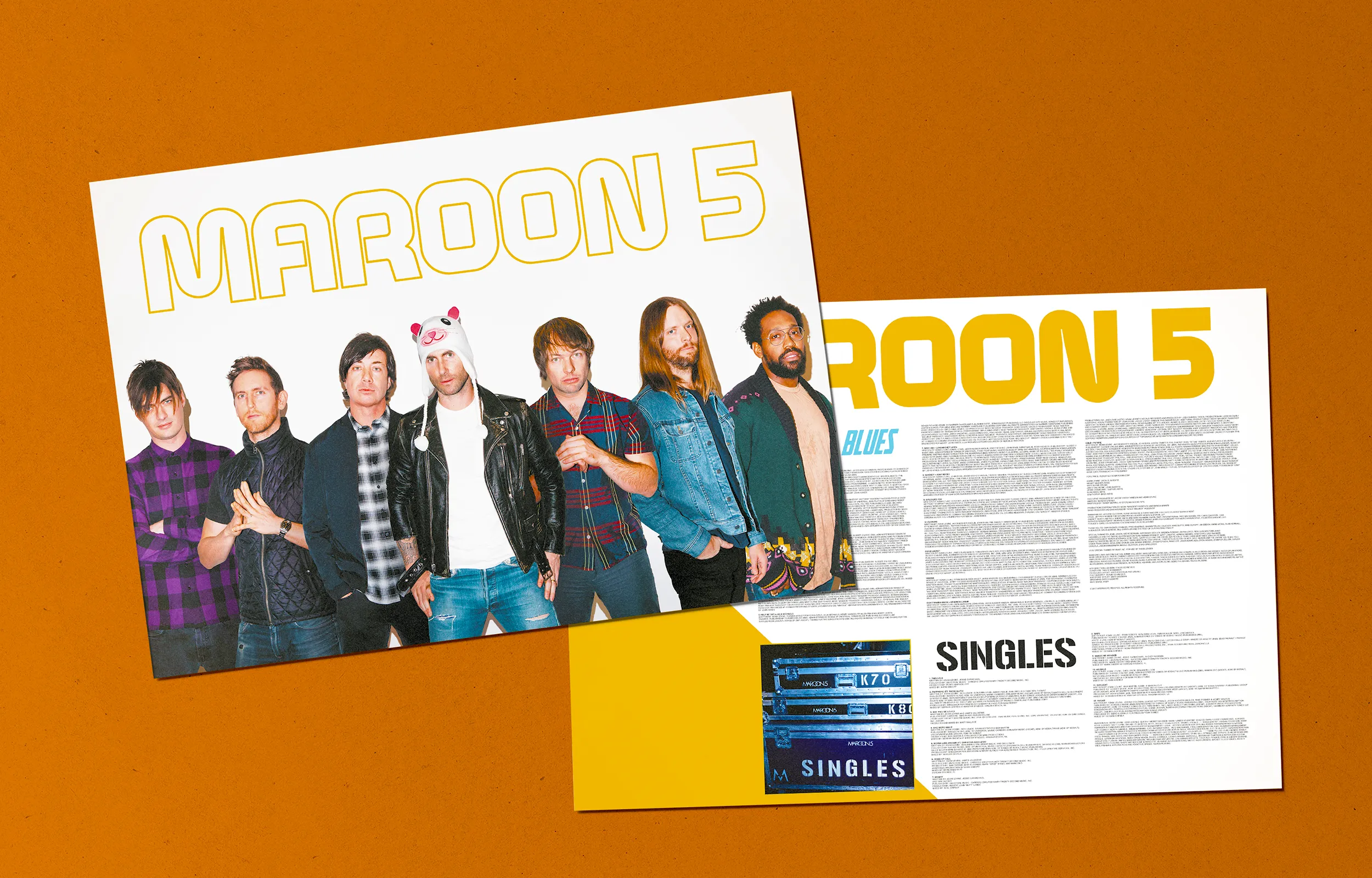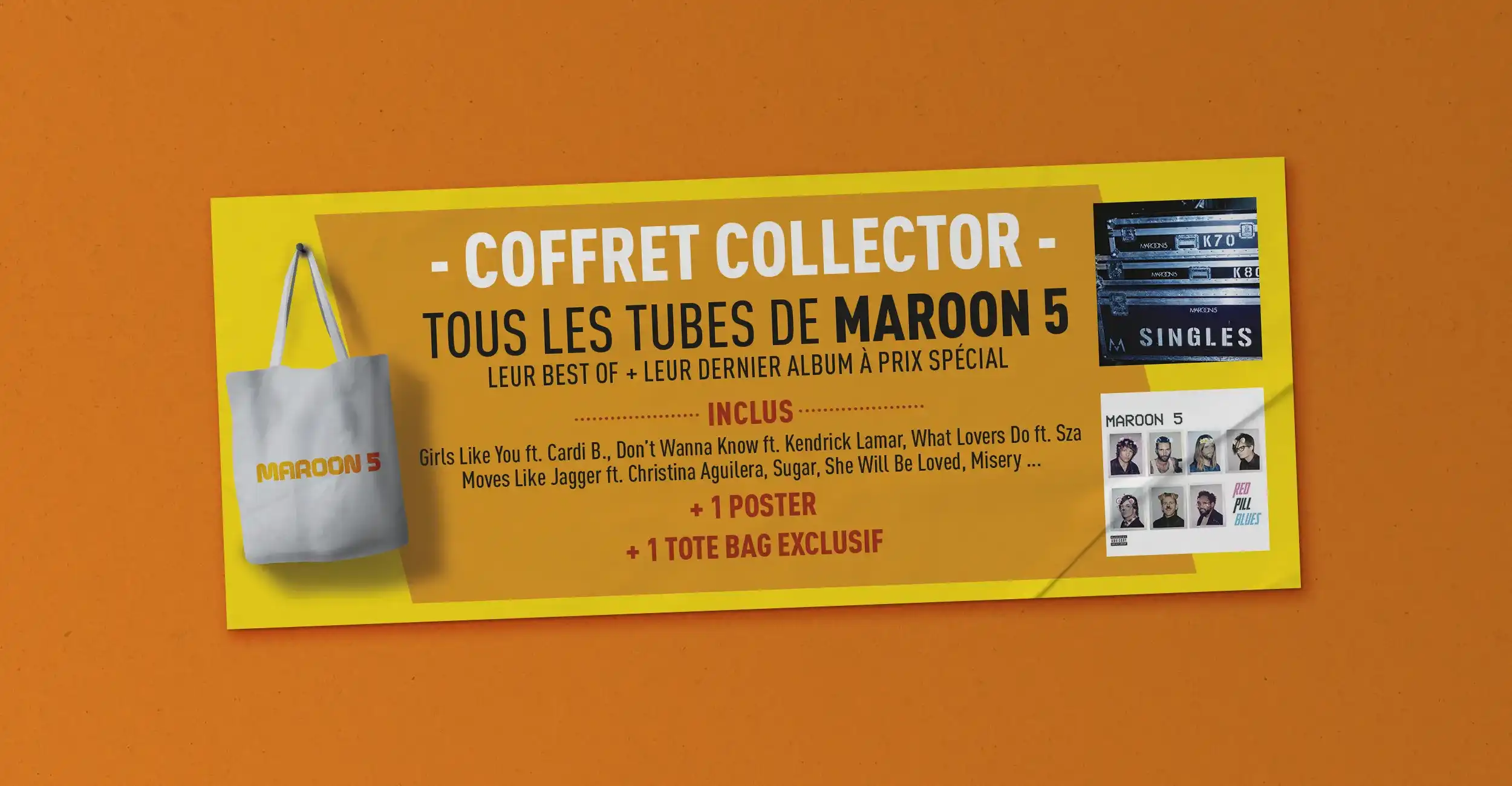 Création de la cover et de la mise en page du coffret 2 CDs Maroon5 avec totebag et poster.