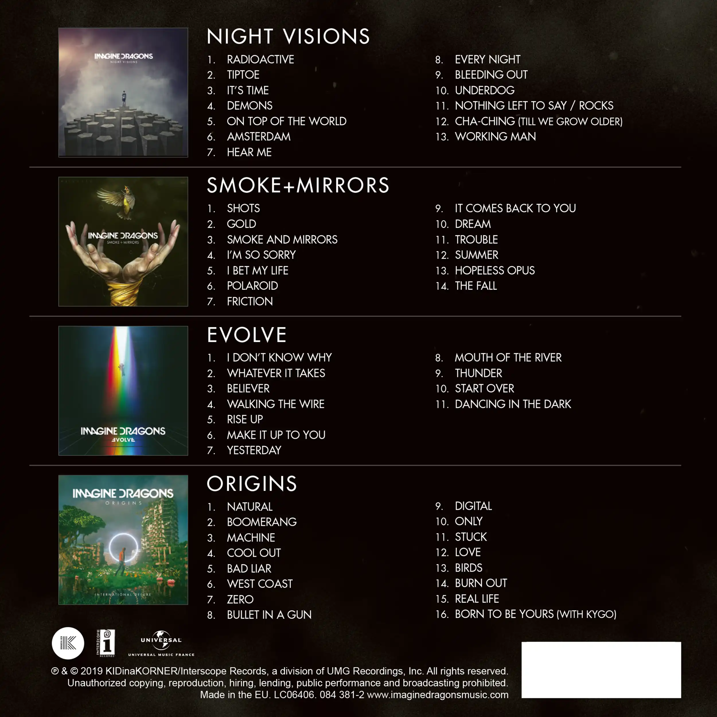 Création de la cover et de la mise en page du coffret 4 CDs d'Imagine Dragons avec poster.